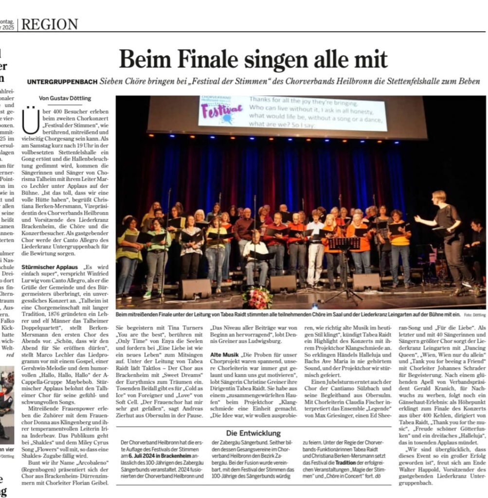 Für den 7. November 2026 plant der Chorverband Heilbronn zum dritten Mal das „Festival der Stimmen“, das zuletzt am 18. Oktober 2025 in Untergruppenbach und am 6. Juli 2024 in Brackenheim stattfand. Das Festival vereint das Beste der erfolgreichen Veranstaltungen „Magie der Stimmen“ und „Chöre in Concert“. Es können 8 Chöre aus dem Chorverband Heilbronn teilnehmen, zu dem seit 2024 auch das Zabergäu gehört.